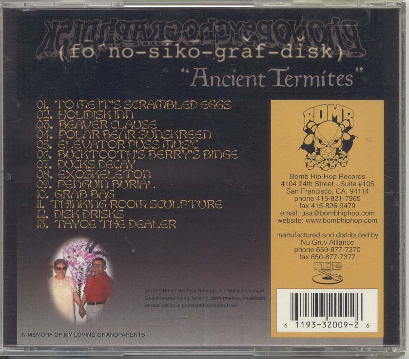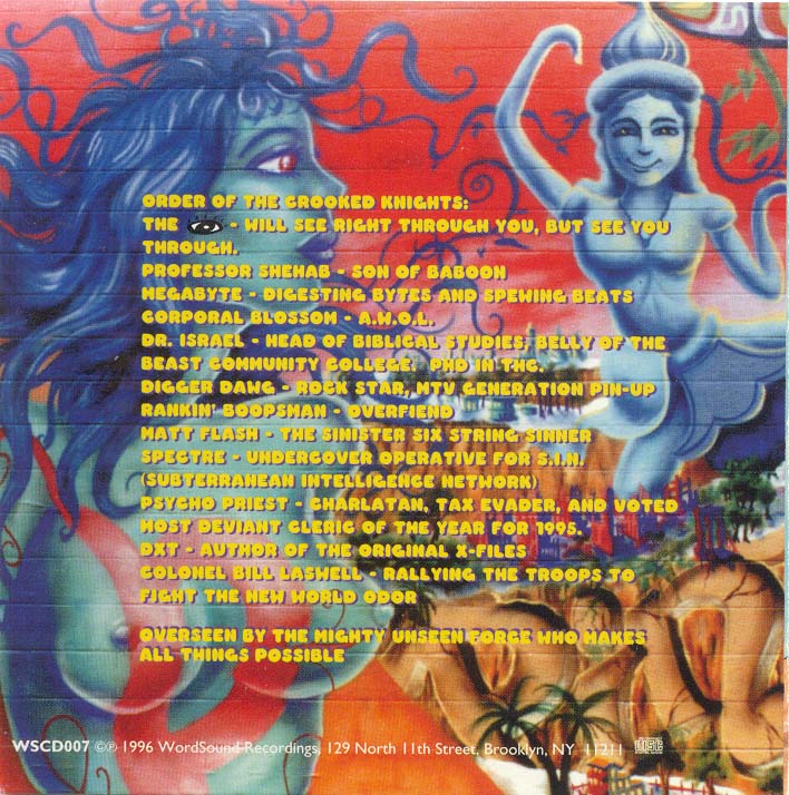 Ok I forgot to add this with the above All in the family rants. But maybe it's for the best because I get to show off that I have this CD here. Not like anyone gives a shit. When Rammellzee bust in that has to be one of my favorite `SOUNDS' for a Emcee voice .. 2nd to that would be that part in the Restiform Bodies track when it goes all Crazy .. man you can't undersatnd ANYTHING they say in both of these tracks. Use my vocals and everything will sound AWESOME .. use effects you FUCKERS rock me like some fucking up drug damged white guy who is too smart wandering around a deserted train yeard or some shit. Man I am too deep to live... Yeah Aaron keep telling yourself that.