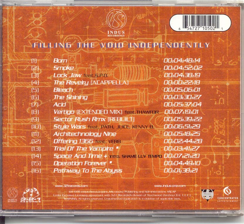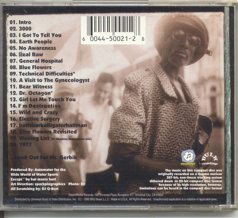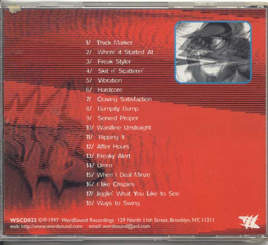 forth track of the Dubadelic Album 2000 A BASS ODYSSEY released on wordsound wsc007 Fucking awesome dub-mutant hip-freak beat. Sound like if Ice cube and Max Hedrome were giving you a root canal while you are on a giant pill of condensed shrooms like Billy Crudup in the flim Jesus Son. As you are getting drilled and scapped you see a army of black panter smurfs that are maching in unison coming to kill you. Great beat for my lyrics.