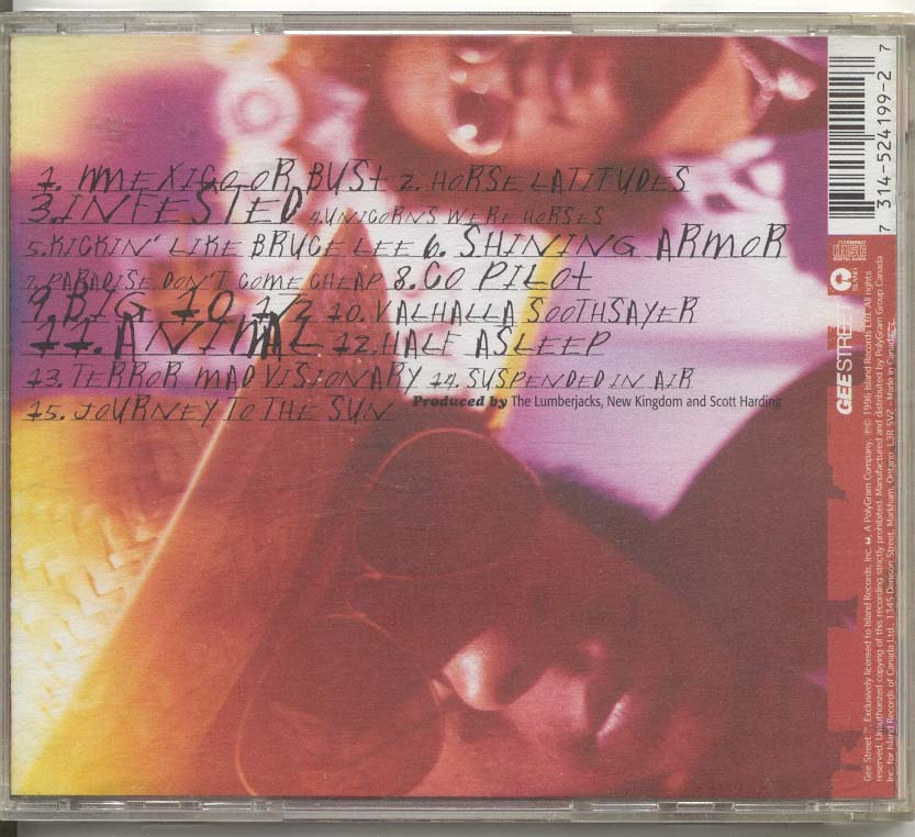 Ok I do not really like this CD that much. And the song I picked to ram on this page I do not like that much either. But I quess it's my favorite. And I think it's probably the best track because it's like the first one and I am never wrong about anything. It's pretty freaky really. I guess I felt like I HAD to buy it because it was .. I don't know a bunch of smart weird techy white dudes doing some kind of avant live experimetnal hip-hop and it was on Matador so like Kevin Martin probably thought they were cool. I never dreamed about a CD but if I was to be on any label I like Matador I think. Could someone call them and see if they would put out a CD of me please? I am not joking my DREAM was to just be a rapper but for some reason I think that label is cool. If they don't like the fucked up shit I say I am just saying that because I am trying to say more fucked up shit then Necro and Cage . just ..Umm I don't know .. because. Beside I have a feeling everyone on TigerBeat does not get paid. You just get to be excited that people who the marketing plan worked on will now kiss your ass.